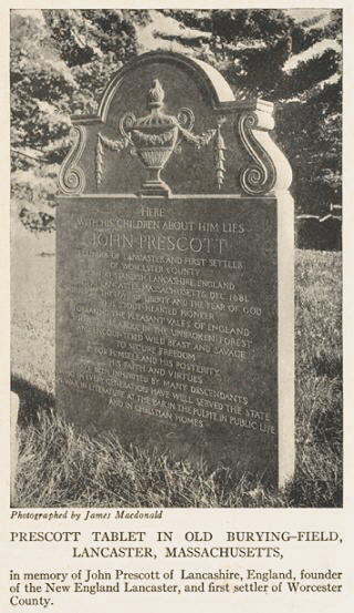John Prescott, the father of Mary, was the founder of Lancaster, Mass. He was born in Standish, England in 1604. He married Mary Platts at Wygan, Lancashire, January 21, 1629; he died in America in 1683. He left England to avoid persecution. In 1638 he landed at Barbadoes, where he bought land. In 1640 he came to New England and settled in Watertown. In 1643, with Thomas King and others, he purchased 'Nashaway' (a part of which is now Lancaster), and became one of the earliest settlers. Nourse, in his 'Annals of Lancaster' says the town would have been named 'Prescott' had its founder been a freeman; but he had never given public adhesion to the established church covenant, and was therefore incapable of voting or holding office. In 1669, however, he was admitted freeman. He was a farmer, blacksmith and millwright. John Prescott was a heroic figure in the early history of Lancaster and Groton. He brought with him a metallic coat of mail, which he sometimes wore when dealing with the savages; this served to impress them, as his force, capacity and judgment did his white neighbors. Nourse calls him an 'ideal pioneer' a 'true builder of the nation.' He distinquished himself for bravery and leadership in the Indian Wars. He served in the garrison at Lancaster and in the defense of the town against the Indians on August 21, 1675 and February 10, 1676. He had a numerous family of descendants, many of whom have been persons of great ability and distinction. His great-grandson, Colonel William Prescott, was chief in command at the Battle of Bunker Hill. Another descendant was William H. Prescott, the famous historian of the 'Conquest of Mexico,' 'Conquest of Peru.' At the time of his death, in 1683, his family had become one of the wealthiest and most influential in Massachusetts. John and Mary (Platt) Prescott had eight children.
